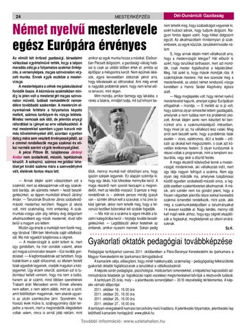 Gyakorlati oktatók pedagógiai továbbképzése Pedagógiai tanfolyamot szervez 2011. októberében a Pécs-Baranyai Kereskedelmi és Iparkamara a Magyar Kereskedelmi és Iparkamara támogatásával. A kamaránk célja, elôsegíteni, hogy minél hatékonyabb, szakmailag – pedagógiailag felkészültebb gyakorlati oktatók foglalkozzanak a tanulókkal a vállalkozásoknál. A képzés során pedagógiai, pszichológiai, módszertani ismeretekkel, a képzéshez kapcsolódó adminisztrációs feladatok (pl. foglalkozási napló vezetése) megismerésével bôvítjük a résztvevôk tudását. A tanfolyam 25 órás, mely – a jelentkezés sorrendjében – 30 fô részvételéig térítésmentes. A képzés várható idôpontjai: 2011. október 18., 16.00 óra 2011. október 20., 16.00 óra 2011. október 25., 16.00 óra 2011. október 27., 16.00 óra A tanfolyam elvégzésérôl kamarai tanúsítvány kerül kiadásra. A jelentkezés folyamatos, jelentkezési lap letölthetô kamaránk honlapjáról: www.pbkik.hu