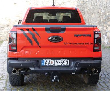 lyos kijelzôkkel és a kapcsolódó szolgáltatásokkal. Gyakorlatilag mindent tud a Raptor, amit ma egy középkategóriás autótól elvárhatunk. Az egyetlen valódi kritika a fedélzeti rendszert érheti, nagyon furcsa, hogy nem tud magyarul a rendszer. Tetszik, hogy az eredeti funkcióról sem feledkeztek meg, a tetôkonzolon kialakítottak kapcsolókat az utólagos extráknak, így egy csörlô vagy raktérvilágítás felszerelése után sem kell utólagos kapcsolókat beépíteni. Nagyon hasznos az is, hogy az egyébként remek külsô kamerák képére nem csak tolatáskor, hanem elôremenetben is ki lehet vetíteni a nyomvonalat, így a manôverezés is könnyû az autóval. Érdekes figyelmesség, hogy megálláskor nem sípol az autó, ha nem rakjuk P fokozatba a tízfokozatú automatváltót, egy kis villanymotor automatikusan oda állítja. A hátsó üléseket is kipróbáltam, mert a nagyon kényelmes elsôk után ránézésre szûkebbnek tûntek, de két utasnak ott is elegendô a hely. Az amerikai gyökerekre pedig az is utal, hogy a középsô két pohártartó mellett még kettô a mûszerfal szélébôl is kihajtható.