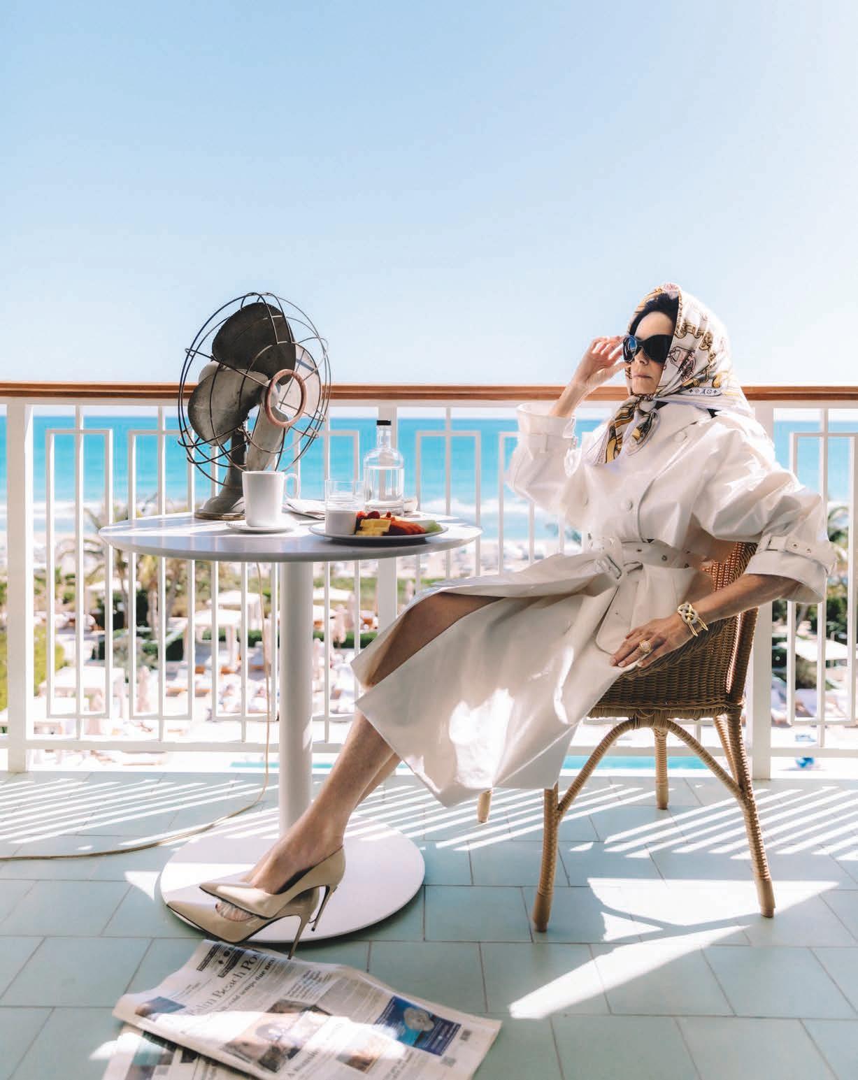 Sateen trench coat ($4,995), polished pumps ($875), DNA sunglasses ($410), Dolce & Gabbana, Bal Harbour Shops, Miami Design District, dolcegabbana.com; Bejeweled square 90 scarf ($485), Louis Vuitton, Aventura Mall, Miami Design District, us.louisvuitton.com; Infinity Knot bracelet with diamonds set in 18-karat gold ($83,500), Polka Dot ring with white cocholong and diamonds set in 18-karat gold ($9,500), Verdura, Greenleaf & Crosby by Betteridge, greenleafcrosby.com