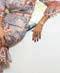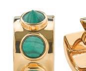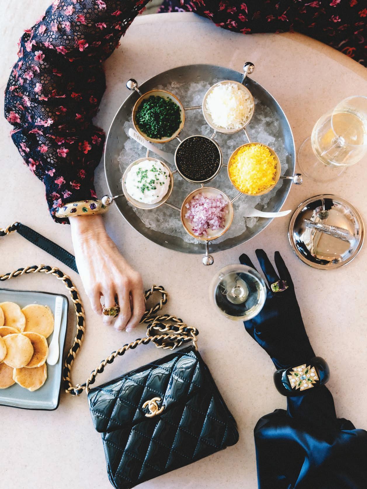 Cotton embroidered guipure blouse ($9,600), satin gloves ($1,675), handbag ($6,500), Chanel, Aventura Mall, Bal Harbour Shops, Miami Design District, chanel.com; (on left arm/hand) Mosaic cuff with colored gemstones set in 18-karat gold ($76,500), Three-Stone ring with green and brown garnets set in 18-karat gold ($24,500), (on right arm/hand) Maltese Cross cuff with black jade, aquamarines, peridot, diamonds, pearls, and 18-karat gold ($41,500), Three-Stone ring with amethyst and peridot set in 18-karat gold ($17,500), Verdura, Greenleaf & Crosby by Betteridge, greenleafcrosby.com