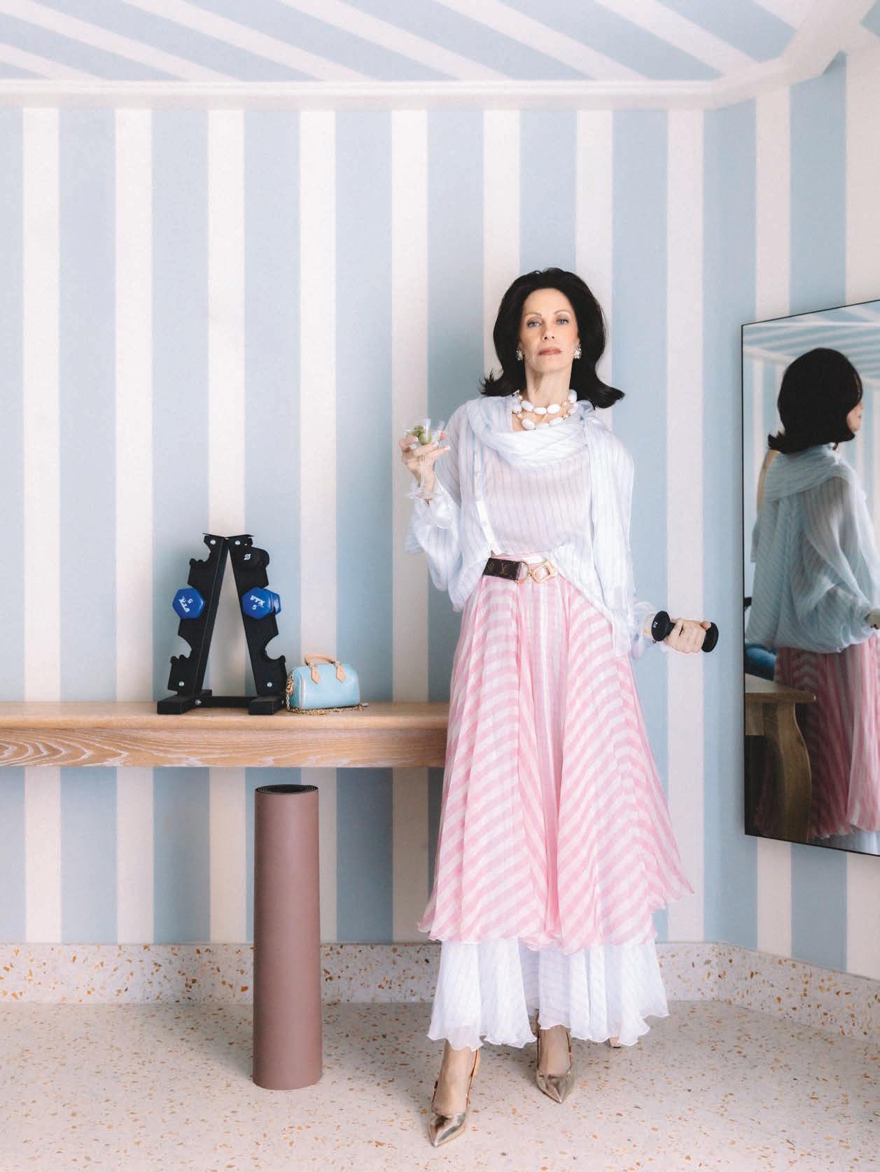 Dress with attached shirt ($5,900), Valentino Garavani sandals ($980), Valentino Garavani Moon bag ($3,390), Valentino, Aventura Mall, Bal Harbour Shops, Miami Design District, valentino.com; The Grip oval sunglasses ($525), Alexander McQueen, Bal Harbour Shops, Miami Design District, alexandermcqueen.com; sun hat ($200), Sarah Bray Bermuda, sarahbraybermuda.com; Lion’s Paw Shell ear clips with diamonds set in 18-karat gold ($31,500), Copa ring with white opal set in 18-karat gold ($9,500), Verdura, Greenleaf & Crosby by Betteridge, greenleafcrosby.com.
