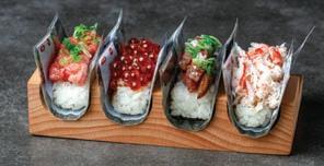 In terms of starters, he suggests considering the foie gras macaron, which showcases “European-style and wood-fire cooking,” he notes, and the “buffalo” chicken wing stuffed with lobster and rice and dressed in handmade Kanzuri