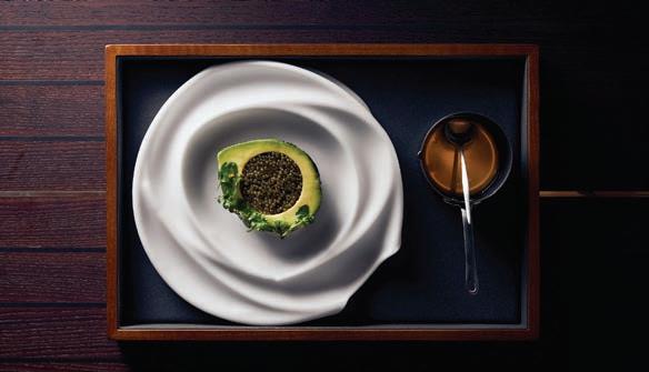 An à la carte menu is divided into four sections—Snacks, Starters, Mains, and Desserts—from which guests are encouraged to share several items. Two standout starters from this pescatarian’s feast included an epic scallop crudo in smoked vinegar and yuzu with gold-leaf sea urchin truffles and a sea urchin–crowned pastry, as well as a charred avocado stuffed with king crab and Osetra caviar. A main of wood-grilled Spanish turbot (filleted tableside) soon stole the show, accompanied by a donabe (clay pot) of sizzling Japanese rice with maitake mushrooms in a buttermilk vinaigrette plus a side of tempura-fried “fish wings’’ (the turbot’s fins) with beer aioli. According to Ratino, the turbot is a dish demonstrative of his award-winning talents and the ideology behind Maass. “[It] is a great blend of things we love from Europe and Japan,” he explains.