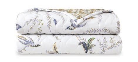 This Grimani coverlet ($695) from Yves Delorme is adorned with birds in a thicket of fauna. Pacific White, South Miami (pacificwhiteonline.com)