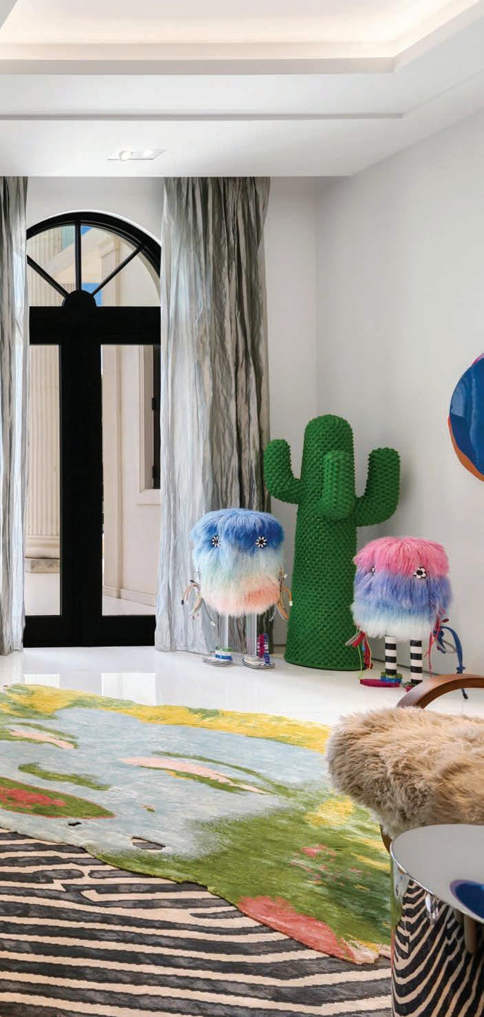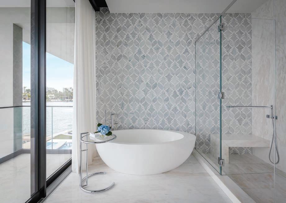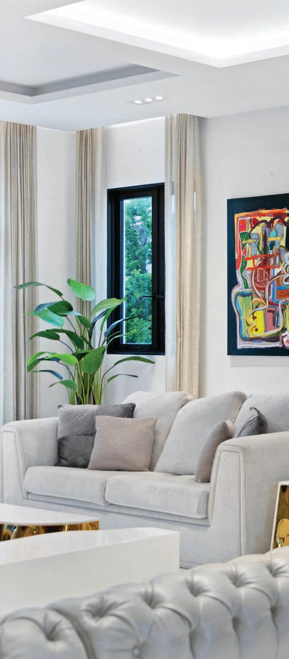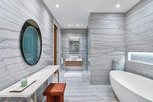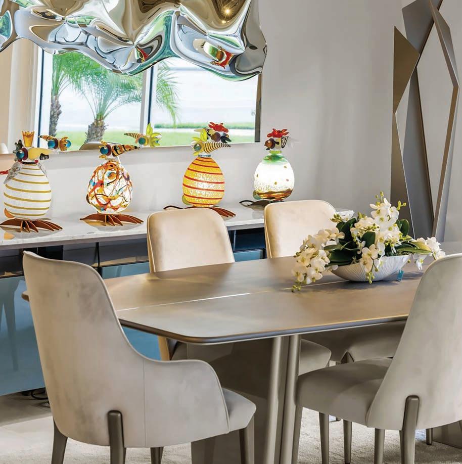 above: “A harmonious blend of marble walls, smoked mirrors, and organicshaped furniture creates an inviting and snug atmosphere,” says Racy. The designers called on Snaidero for the kitchen cabinetry and BKF Decor Solutions for the Fior di Bosco marble slab backsplash. Studio Glass manufactured and installed the mirrored walls. Two of the homeowner’s favorite furnishings include the cocktail table made of curved and hammered smoked glass from Arketipo and the curvy Eli Fly lounger by Jai Jalan.