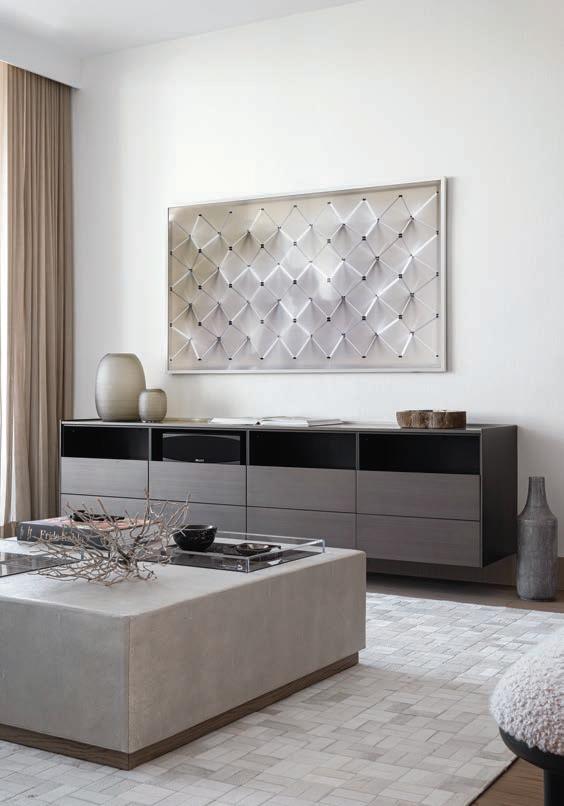 left: A contemporary Aston sideboard by Cattelan Italia, fashioned with wood, metal, and leather is not only functional but also refined for the space. The painting above it, Almost by Silvia Berton, inspired the residence’s gray color palette.