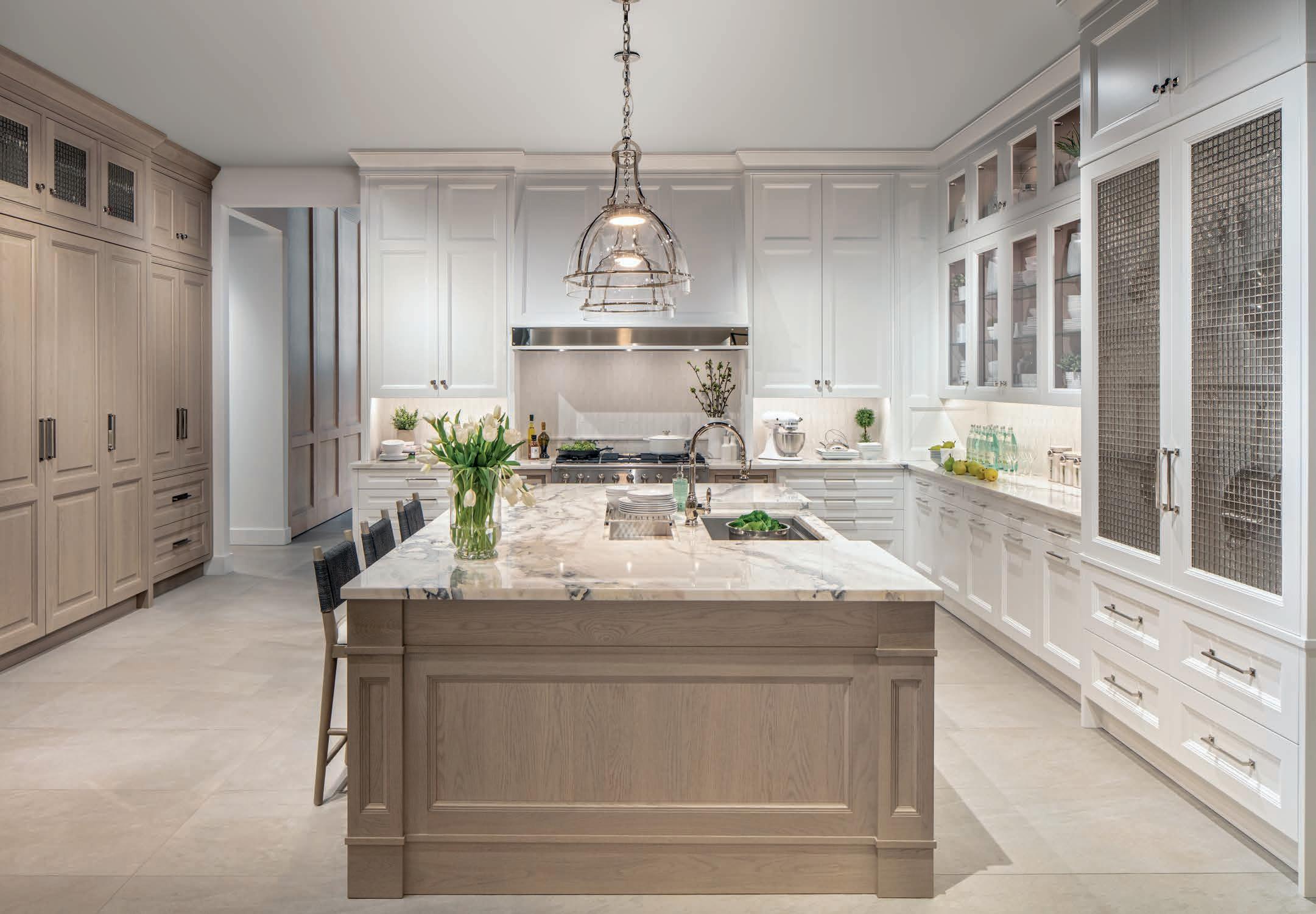 Two-tone cabinetry (using a main color for most of the cabinetry and an accent color on the island or base cabinets) is having a moment. Consider playing with textures and finishes, like mixing high-gloss lacquer with matte lacquer or pairing a textured wood grain door with a painted door. You can even use two different door styles, as long as they relate well.