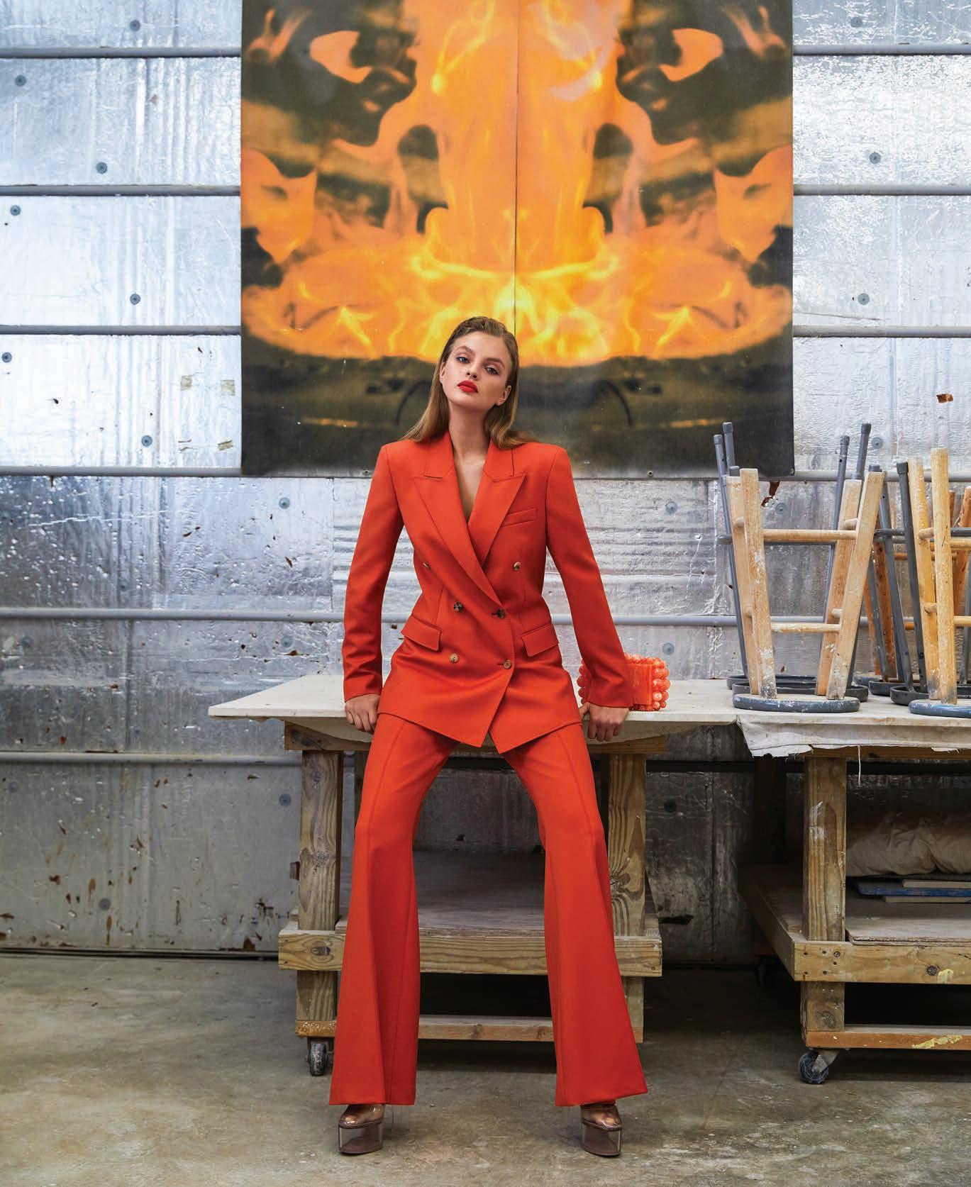 Double-breasted cashmere blazer ($2,090), flare-leg crepe pants ($1,090), Gabriela Hearst, Saks Fifth Avenue, Aventura Mall, saks fifthavenue.com; Valentino Garavani pumps ($920), Valentino, Bal Harbour Shops, Miami Design District, valentino.com; Eos marbled acrylic clutch ($348), Cult Gaia, Saks Fifth Avenue, Bal Harbour Shops, Miami, saksfifthavenue.com