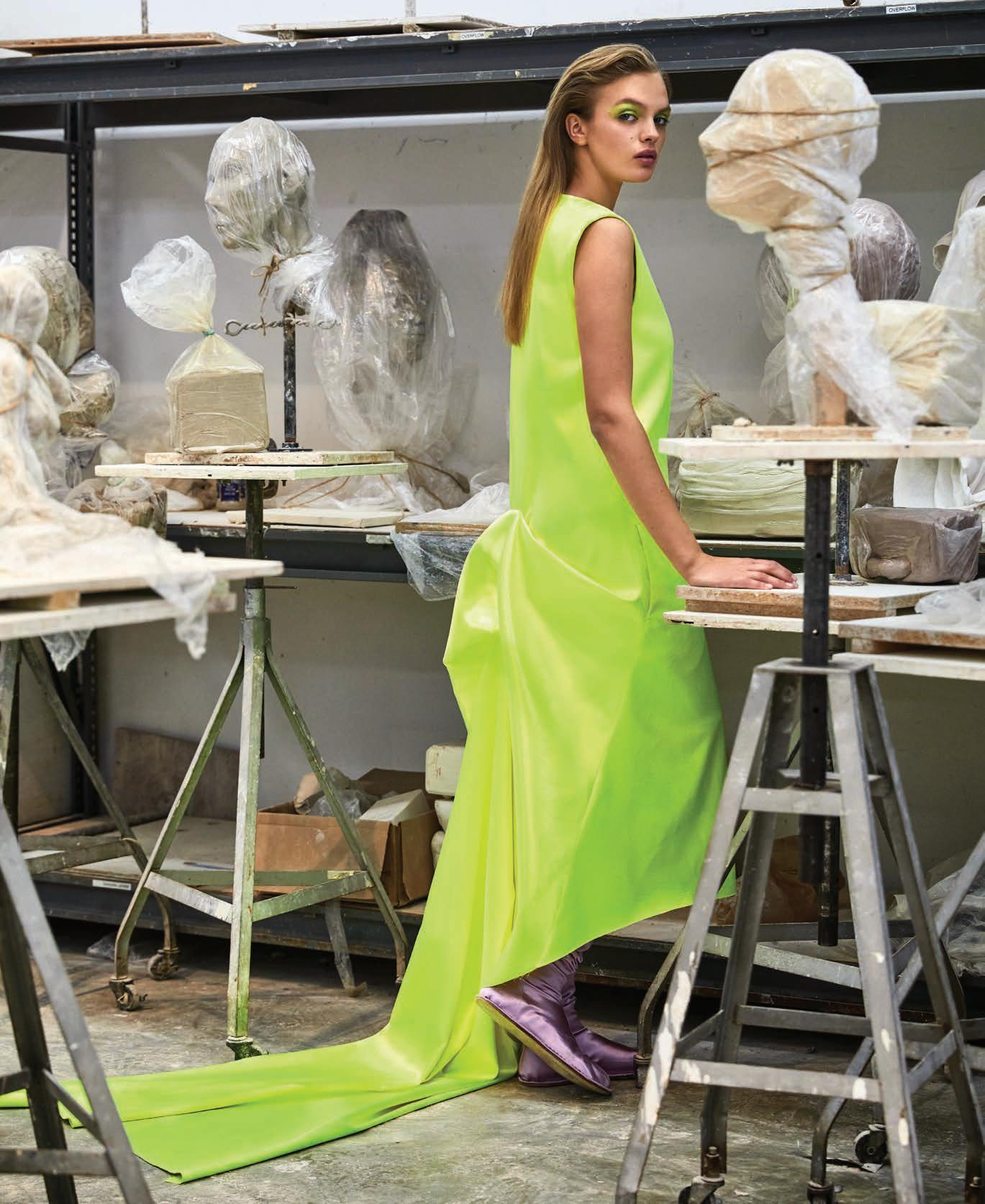 Jersey dress ($1,685), Proenza Schouler, Saks Fifth Avenue, Bal Harbour Shops, saksfifthavenue.com; satin boots (price upon request), Sportmax, sportmax.com
