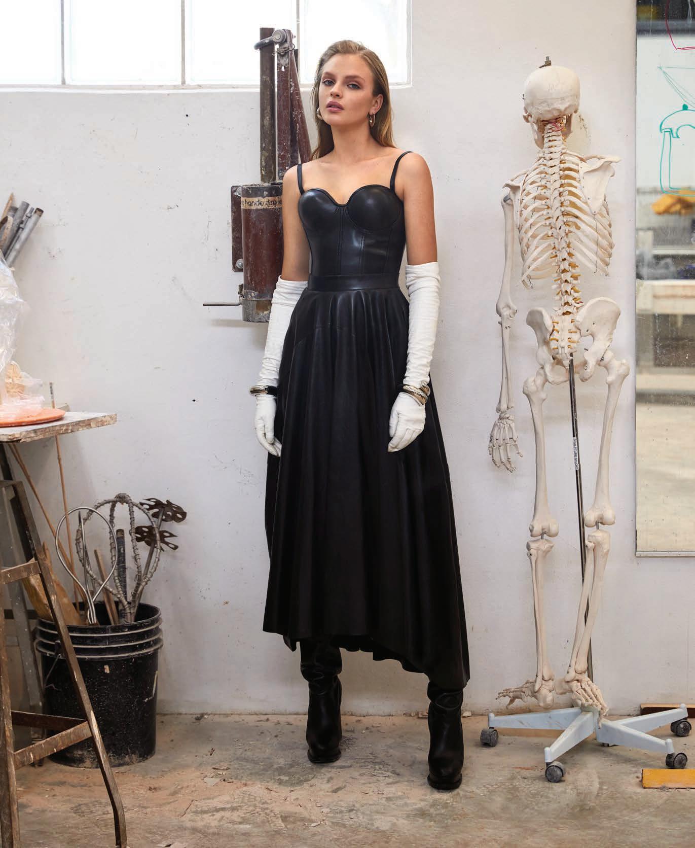 Corset ($2,790), skirt ($6,290), gloves ($940), boots ($1,890), cuffs ($1,690 each), earrings ($590), Alexander McQueen, Miami Design District, alexandermcqueen.com