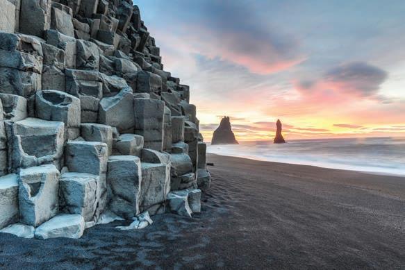 You’ll feel the power of Mother Nature on the volcanic black-sand beaches of Reynisfjara, where towering sea stacks jut from the Atlantic Ocean and powerful waves thunder ashore. The jagged basalt cliffs (a backdrop for cinematic works like Game of Thrones and Star Wars) are a perfect spot to snap Instagram-worthy pictures—but beware of sneaker waves, which have swept away unsuspecting visitors.