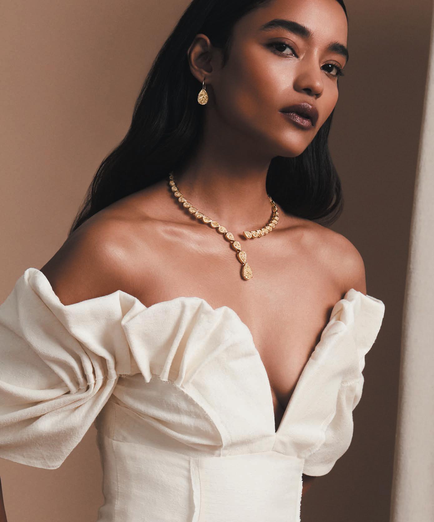 Maria maxi dress ($498), Lilly Pulitzer, Waterside Shops, Naples, Thirteenth Avenue South, Downtown Naples, lillypulitzer.com; Hangisi navy blue silk jewel buckle pumps ($1,415), Manolo Blahnik, manoloblahnik. com; vintage hat ($145), Dina C’s Fab and Funky Consignment Boutique, West Palm Beach, dina-cs-fab-and-funky-consignment-boutique. myshopify.com; yellow beryl pear-shape earrings with diamonds and yellow and white sapphires set in 18-karat gold ($42,000), alexandrite and diamond paddle ring in 18-karat white gold (price upon request), Martin Katz, martinkatz.com; the Wooden Whaler’s Wife bangle ($350), the Captain bangle ($195), the Whaler’s Daughter bangle ($250), Danielle Rollins, West Palm Beach, danielledrollins.com