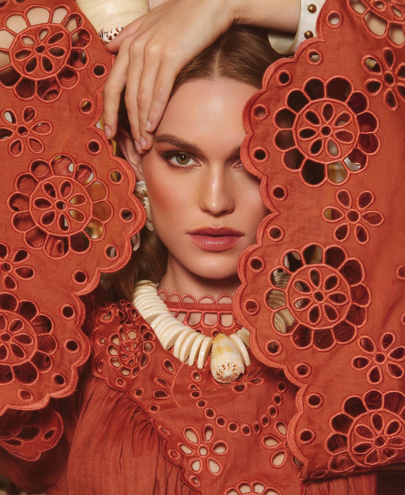 Awaken embroidered yoke maxi dress ($1,350), Zimmermann, Waterside Shops, Naples, zimmermann.com; vintage shell earrings ($115), vintage shell necklace ($245), vintage ring ($185); wooden bangle with shells ($650), Monies; bangle ($195), Ashley Pittman; all jewelry via Dina C’s Fab and Funky Consignment Boutique, West Palm Beach, dina-cs-fab-and-funky-consignment-boutique.myshopify.com