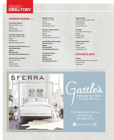 design DIRECTORY INTERIOR DESIGN (cont.) Linda Burke Interiors 2134 Buckingham Lane Naples 239-248-0891 lindaburkeinteriors.com Little Palm Design Group 9051 Tamiami Trail N., #102 Naples 239-598-2001 littlepalmdesigngroup.com Mercedes Courland Interiors, Inc. 13167 Valewood Dr. Naples 239-595-5900 mercedescourlandinteriors.com Norris Furniture & Interiors 5015 Tamiami Trail N. Naples 239-263-0580 norrisfurniture.com