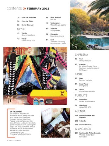 ON THE COVER: Silk jumpsuit, Ralph Lauren, Waterside Shops, Naples; Michael Kors leather belt, Kara Ross bracelet, Marissa Collections, Naples; beige calf peep-toe Mary Jane, Christian Louboutin, New York, christianlouboutin.com; Ermenegildo Zegna silk ascot, Saks Fifth Avenue, Waterside Shops; Nina Runsdorf leather and silver bracelets, neimanmarcus.com Photography by Robert Adamo