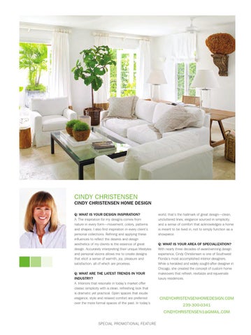 world, that’s the hallmark of great design—clean, uncluttered lines; elegance sourced in simplicity; and a sense of comfort that acknowledges a home is meant to be lived in, not to simply function as a showpiece. Q: What is your area of specialization? With nearly three decades of award-winning design experience, Cindy Christensen is one of Southwest Florida’s most accomplished interior designers. While a heralded and widely sought-after designer in Chicago, she created the concept of custom home makeovers that refresh, revitalize and rejuvenate luxury residences.