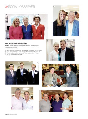 3 LESLIE HINDMAN AUCTIONEERS What: Cocktail reception and private viewing of highlights from upcoming fall auctions 1. Leslie Hindman, Mary Wasmer, Mitzi Magin 2. Maura Ross, Mickey Skinner 3. Sandi and Tom Moran 4. Burns Dobbins, Alexander Eblen, Andrew Lick 5. Myra Janco Daniels, Bob Edwards 6. Robert Goldman, Brian Felcoski 7. Joe Cox, Stephen and Pat Pistner