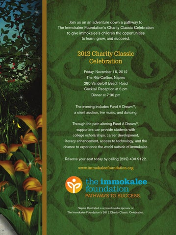 2012 Charity Classic Celebration Friday, November 16, 2012 The Ritz-Carlton, Naples 280 Vanderbilt Beach Road Cocktail Reception at 6 pm Dinner at 7:30 pm The evening includes Fund A Dream™, a silent auction, live music, and dancing. Through the path altering Fund A Dream™, supporters can provide students with college scholarships, career development, literacy enhancement, access to technology, and the chance to experience the world outside of Immokalee. Reserve your seat today by calling (239) 430-9122. www.immokaleefoundation.org