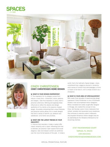 world, that’s the hallmark of great design—clean, uncluttered lines; elegance sourced in simplicity; and a sense of comfort that acknowledges a home is meant to be lived in, not to simply function as a showpiece. Q: What is your area of specialization? With nearly three decades of award-winning design experience, Cindy Christensen is one of Southwest Florida’s most accomplished interior designers. While a heralded and widely sought-after designer in Chicago, she created the concept of one-, three- and five-day custom home makeovers that refresh, revitalize and rejuvenate luxury residences. She continues to execute custom makeovers and exquisite full-service interior designs that are as captivating as the lifestyles embraced by her discerning clientele.