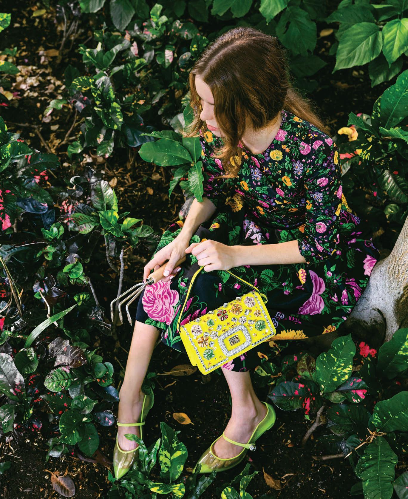 Dress with botanical floral print faille ($2,490), Carolina Herrera, carolinaherrera.com; Virgule Babies heels in patent leather ($1,250), Viv’ Choc Strass Flower mini bag in yellow suede ($4,375), Roger Vivier, rogervivier.com.