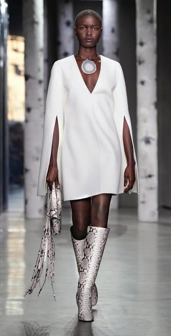 Printed silk muslin dress (price upon request), crumpled shiny boots ($2,775), black patent handbag (price upon request), Chanel, Saks Fifth Avenue, Waterside Shops, Naples, chanel.com