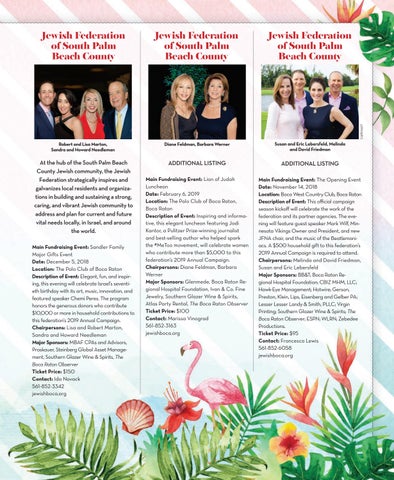 Main Fundraising Event: Sandler Family Major Gifts Event Date: December 5, 2018 Location: The Polo Club of Boca Raton Description of Event: Elegant, fun, and inspiring, this evening will celebrate Israel’s seventieth birthday with its art, music, innovation, and featured speaker Chemi Peres. The program honors the generous donors who contribute $10,000 or more in household contributions to this federation’s 2019 Annual Campaign. Chairpersons: Lisa and Robert Marton, Sandra and Howard Needleman Major Sponsors: MBAF CPAs and Advisors, Proskauer, Steinberg Global Asset Management, Southern Glazer Wine & Spirits, The Boca Raton Observer Ticket Price: $150 Contact: Ida Novack 561-852-3342 jewishboca.org