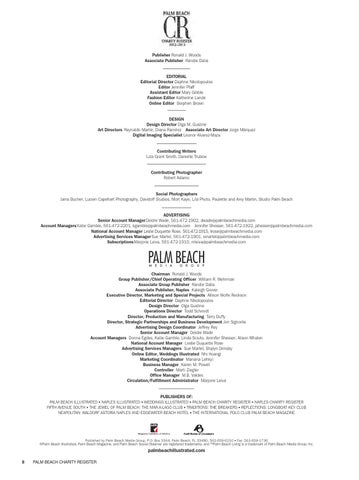 Published by Palm Beach Media Group, P.O. Box 3344, Palm Beach, FL 33480, 561-659-0210 • Fax: 561-659-1736 ®Palm Beach Illustrated, Palm Beach Magazine, and Palm Beach Social Observer are registered trademarks, and ™Palm Beach Living is a trademark of Palm Beach Media Group, Inc.