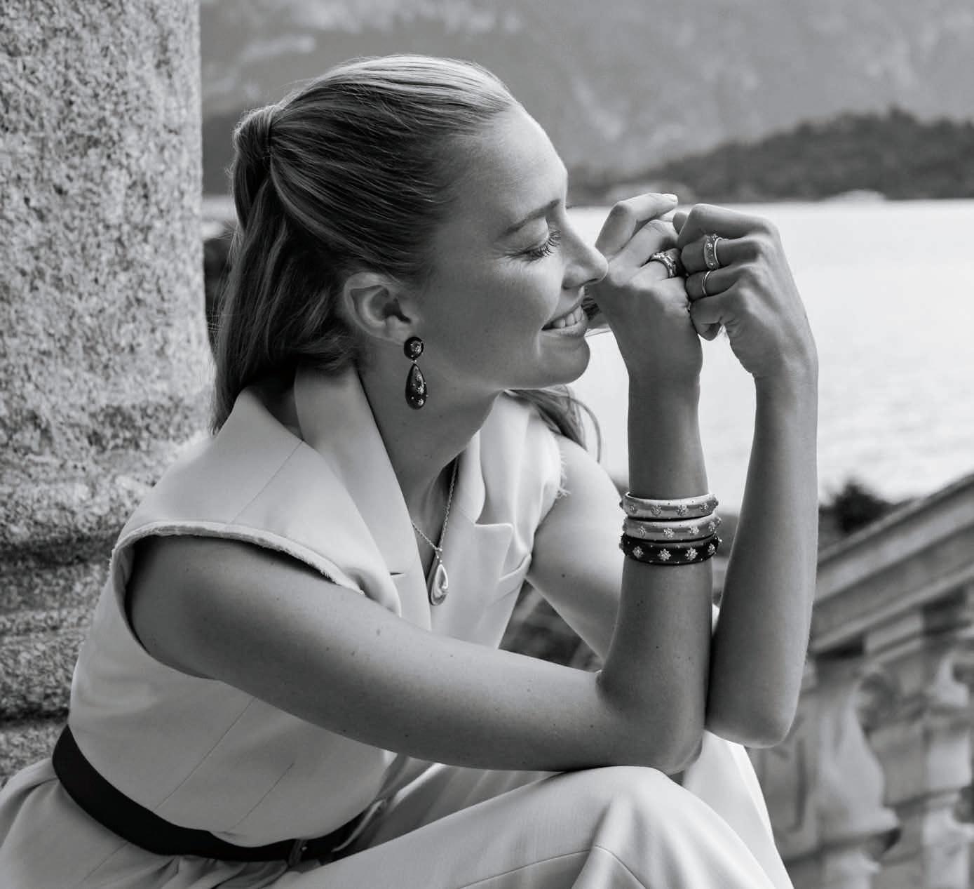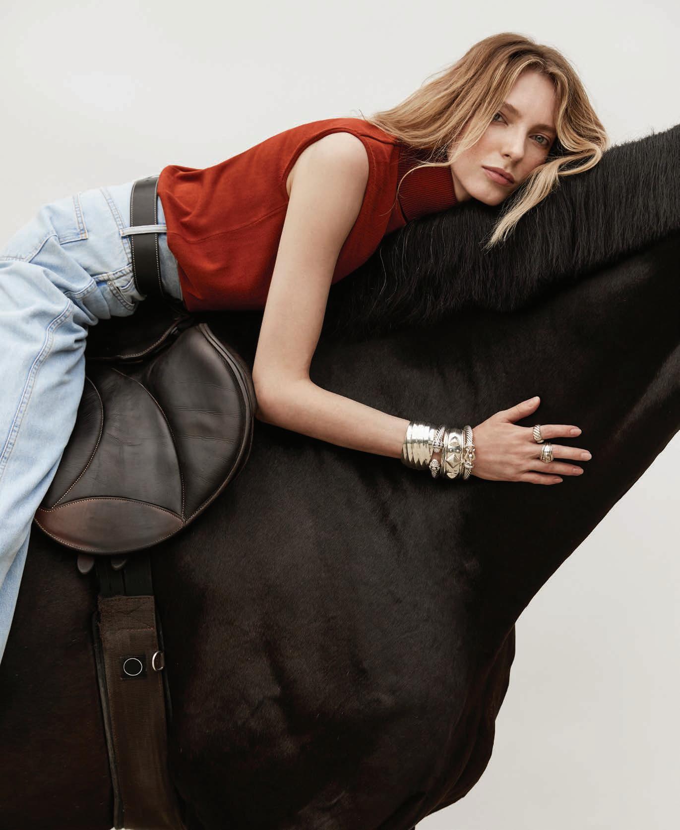 Matte crepe sleeveless turtleneck shell ($498), Lafayette 148 New York, The Gardens Mall, Palm Beach Gardens, lafayette148ny.com; Taylor high-rise wideleg jeans ($298), Veronica Beard, The Royal Poinciana Plaza, Palm Beach, veronicabeard.com; Cable Edge bracelet in recycled sterling silver ($1,200), Modern Renaissance cuff bracelet in sterling silver ($1,950), Renaissance bracelet in sterling silver with pavé diamonds ($3,500), Buckle bracelet in sterling silver with pavé diamonds and Hampton blue topaz ($2,600), Modern Renaissance ring with sterling silver ($800), Sculpted cable ring in sterling silver with pavé diamonds ($1,300), David Yurman, Worth Avenue, Palm Beach, The Gardens Mall, Palm Beach Gardens, davidyurman.com