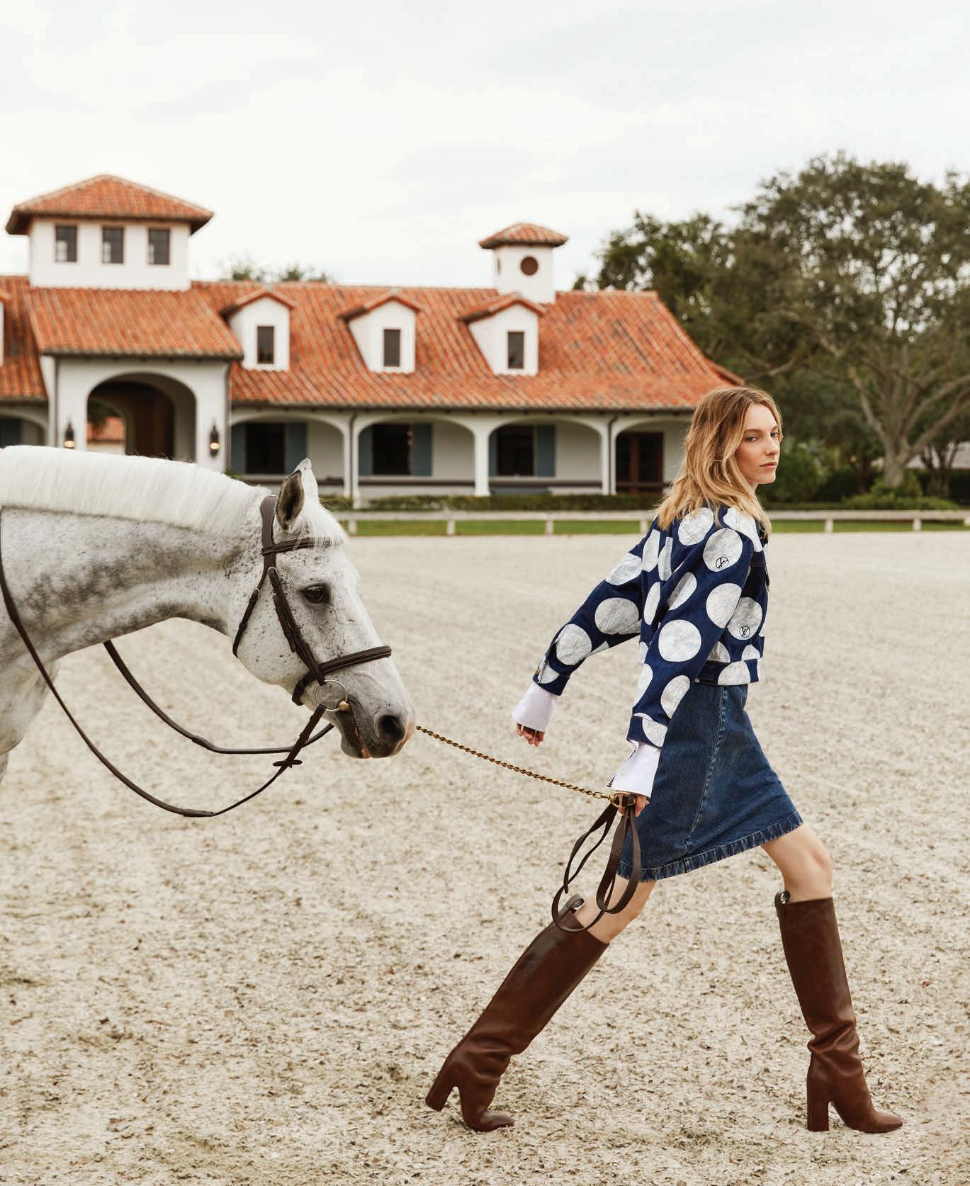 Denim polka dot jacket (price upon request), denim skirt (price upon request), Donna high boots ($2,490), Louis Vuitton, Worth Avenue, Palm Beach, The Gardens Mall, Palm Beach Gardens, Town Center at Boca Raton, us.louisvuitton.com