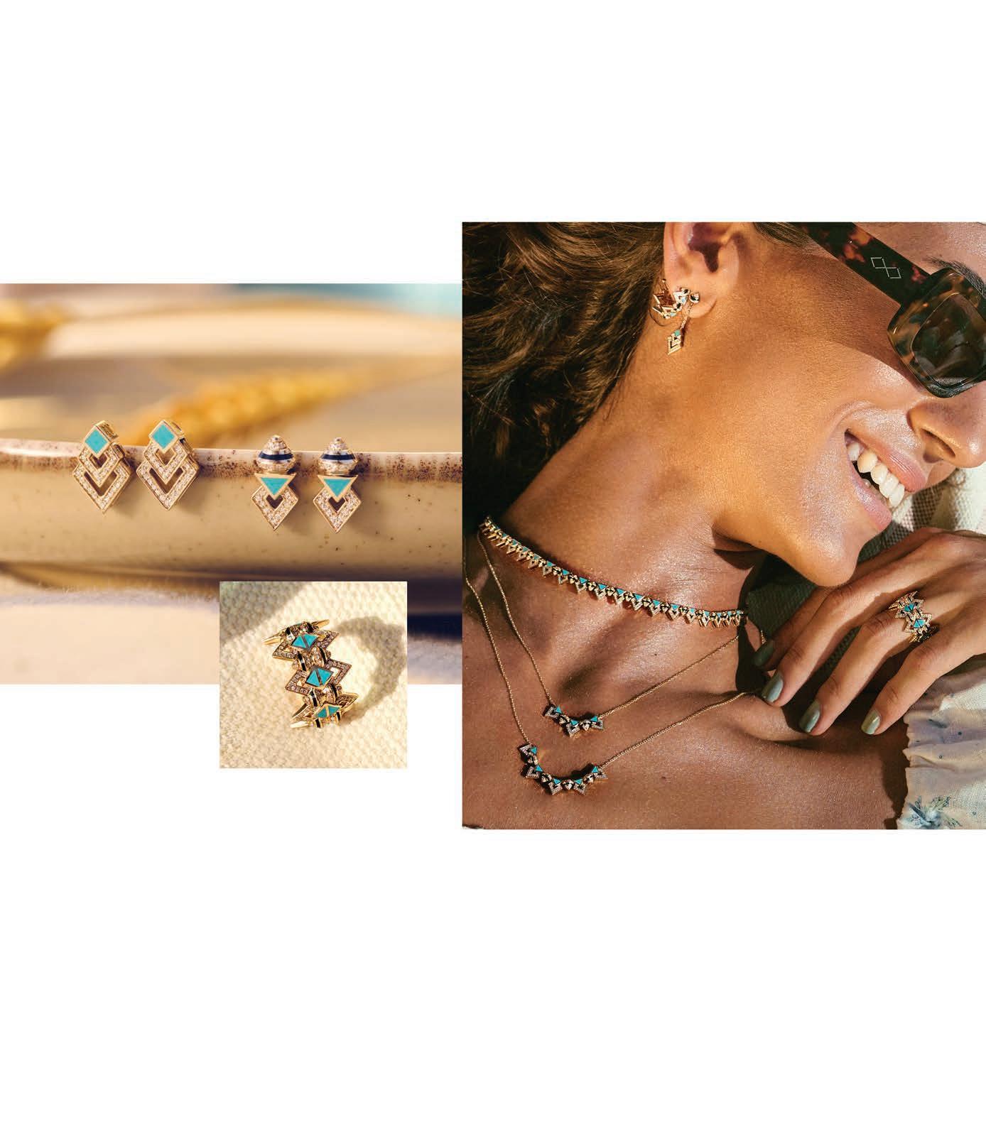 Medusa buckle top ($1,375), Medusa denim miniskirt ($650), Medusa denim mini bag ($1,525), Versace, Town Center at Boca Raton, versace.com; Lexington Y chain necklace in sterling silver with pavé diamonds ($2,500), Madison chain necklace in sterling silver ($925), Crossover hoop earrings in sterling silver with pavé diamonds ($1,500), Renaissance bracelet in sterling silver with pavé diamonds ($3,500), Buckle bracelet in sterling silver with pavé diamonds and Hampton blue topaz ($2,600), David Yurman, Worth Avenue, Palm Beach, The Gardens Mall, Palm Beach Gardens, davidyurman.com