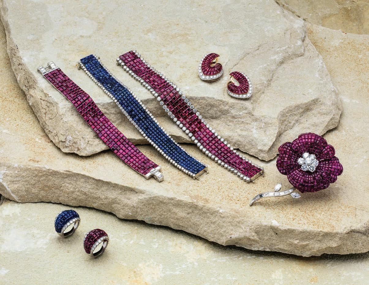 A flower centered by round diamonds, accompanied by petals embellished with calibré-cut rubies. The detachable stem and leaves are set with marquise and baguette shaped diamonds.