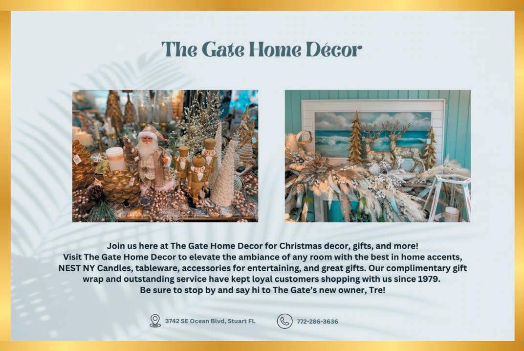Just in time for the holidays, this issue features a special Gift Guide advertising section. I hope it gives you some great ideas for holiday giving, whether for a family member, friend, “host/hostess with the mostest”—or a little something for yourself. All items in the guide are from local businesses, as we always like to promote shopping locally and supporting small-business owners. And don’t miss the Downtown Stuart advertising section, featuring many local spots for your shopping and dining needs this season.
