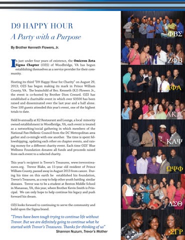 n just under four years of existence, the Omicron Zeta Sigma Chapter (OZS) of Woodbridge, VA has begun establishing themselves as a service provider for their community. Hosting its third “D9 Happy Hour for Charity” on August 29, 2013; OZS has begun making its mark in Prince William County, VA. e brainchild of Bro. Kenneth (KJ) Flowers Jr., the event is co-hosted by Brother Dion Coward. OZS has established a charitable event in which over $3500 has been raised and disseminated over the last year and a half alone. Over 100 guests attended this year’s event, one of the highest totals to date. Held bi-annually at K2 Restaurant and Lounge, a local minority owned establishment in Woodbridge, VA, each event is treated as a networking/social gathering in which members of the National Pan-Hellenic Council from the DC Metropolitan area gather and co-mingle with one another. e time is spent fellowshipping, updating each other on chapter events, and raising money for a different charity event. Each time OZS’ Blue Wellness Foundation donates all funds and proceeds raised from each event to a selected charity. is year’s recipient is Trevor’s Treasures, www.trevorstreasures.org. Trevor Blake, an 11-year old resident of Prince William County, passed away in August 2013 from cancer. During his time on this earth he established his foundation, Trevor’s Treasures, as a way to help other youth battling similar diseases. Trevor was to be a student at Benton Middle School in Manassas, VA, this year, where Brother Kevin Smith is Principal. We can only hope to help continue his legacy and push forward his dream. OZS looks forward to continuing to serve the community and build upon the Sigma brand.