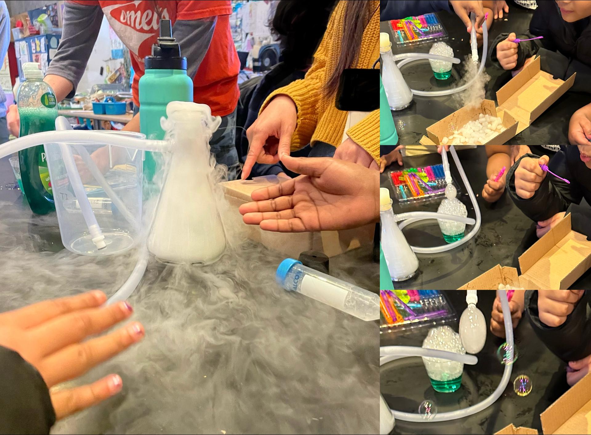 Graduate researchers Jessica Lin (JHU-SOM Neuroscience) and Willow Rock (JHU-SOM Biochemistry, Cellular and Molecular Biology) taught the group about the difference between solids, liquids, and gasses, using a vial of dry ice to demonstrate state transitions. Instead of melting like the H2O molecules in ordinary ice, the frozen carbon dioxide in dry ice sublimates, or goes directly from a solid to a gas state, when below its freezing temperature. By channeling vapor from the sublimating ice down a tube, students got the chance to use it to blow giant bubbles. Willow says that she and Jessica “were thrilled to see the students connect with the science. Among the excited chatter, one student exclaimed “this is the best day ever!””