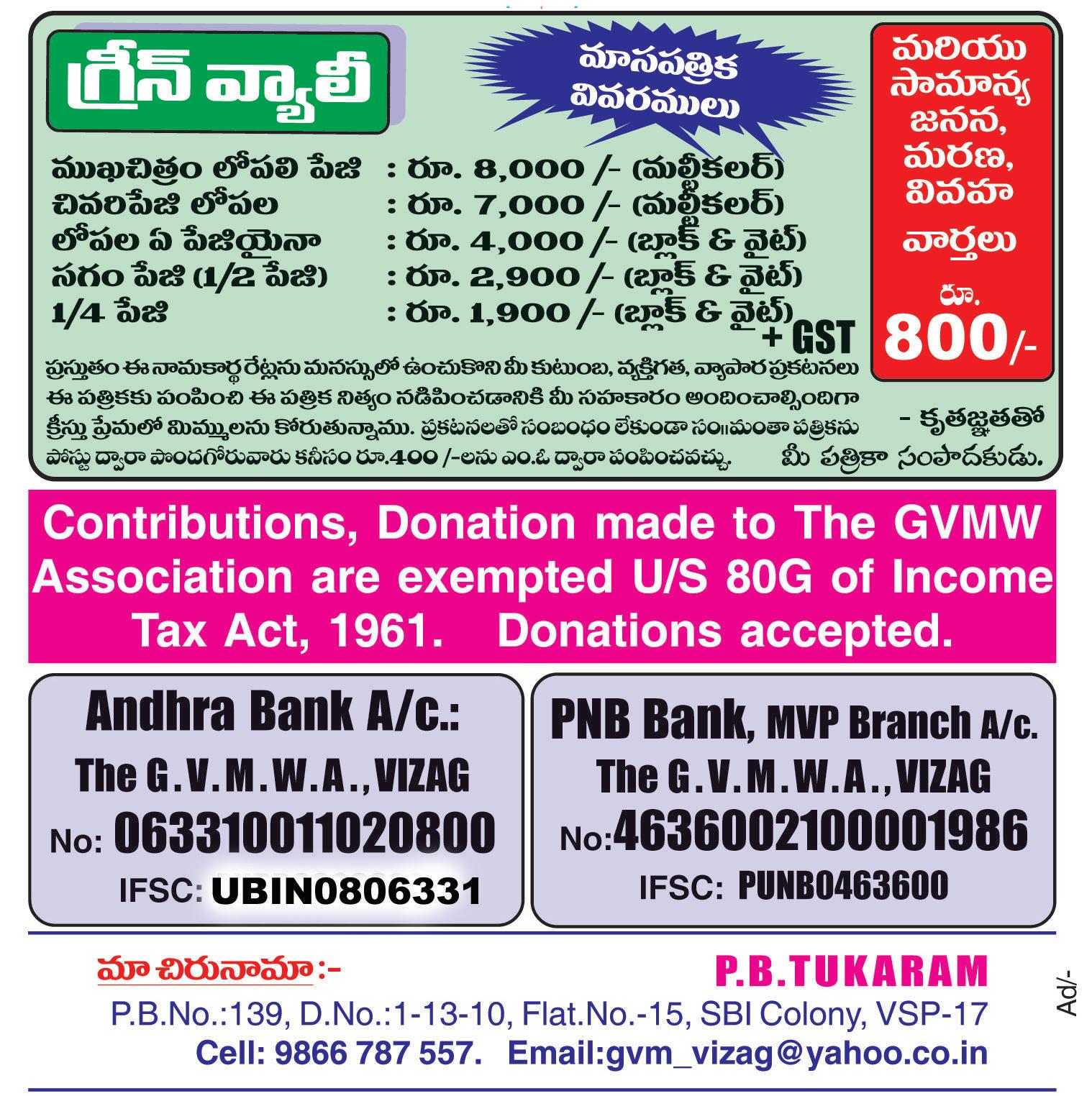 Donation made to GVMWA are exempted U/S 80G of Income Tax Act, 1961. Donations accepted.