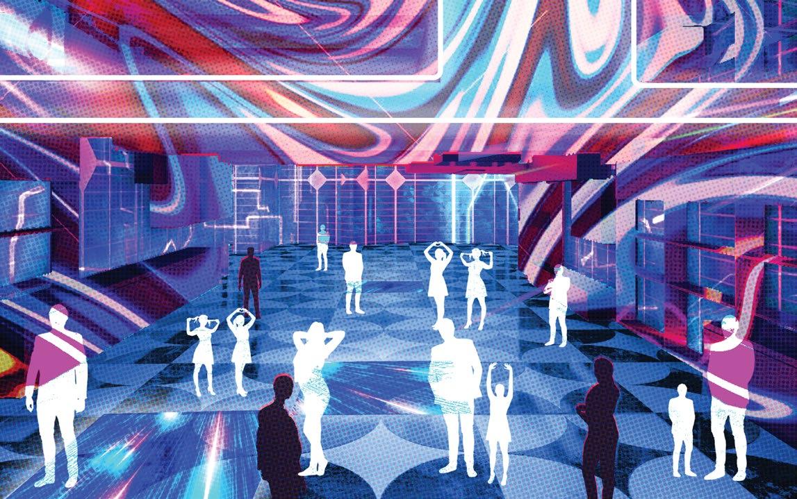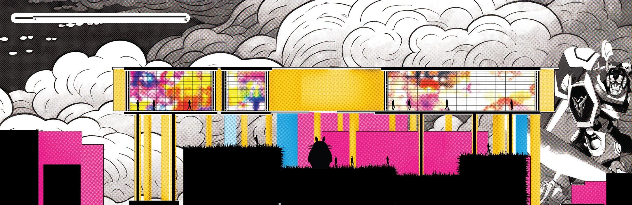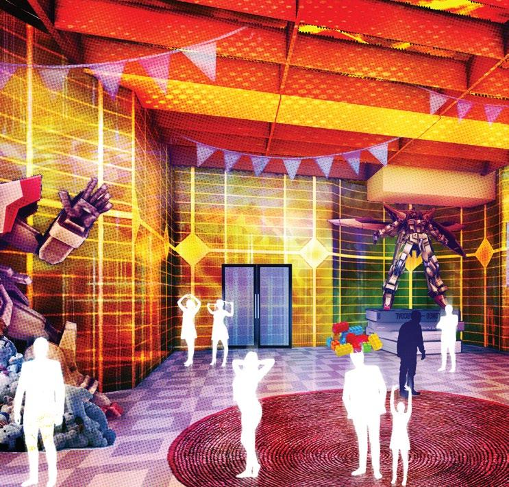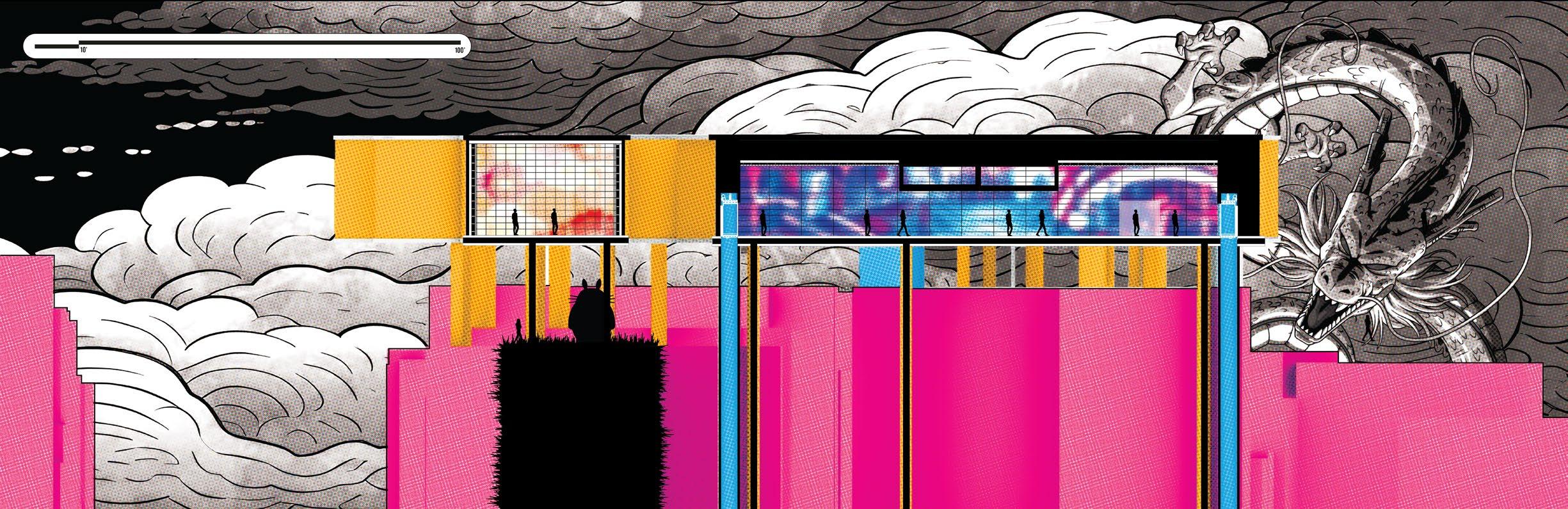 The top layer is an interactive exhibit space, showcasing digital media and immersive storytelling. Between them, the midway layer acts as a transitional urban zone— inviting visitors to move fluidly between everyday life and imaginative exploration