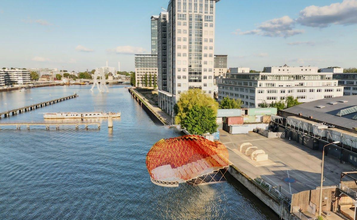 This floating structure draws inspiration from origami tessellation—a technique where repeated geometric patterns fit together seamlessly without gaps or overlaps.