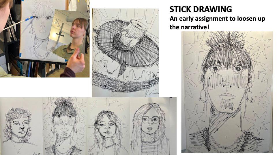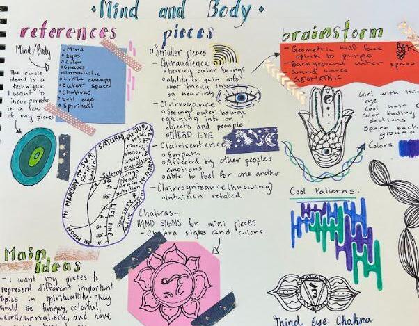 2. Use the ideas and practices stated in the attached lesson to further develop spread. (I show the kids good sketchbook examples)