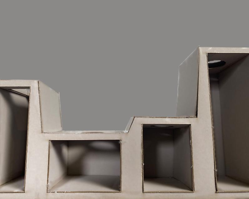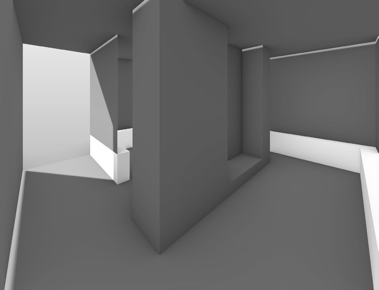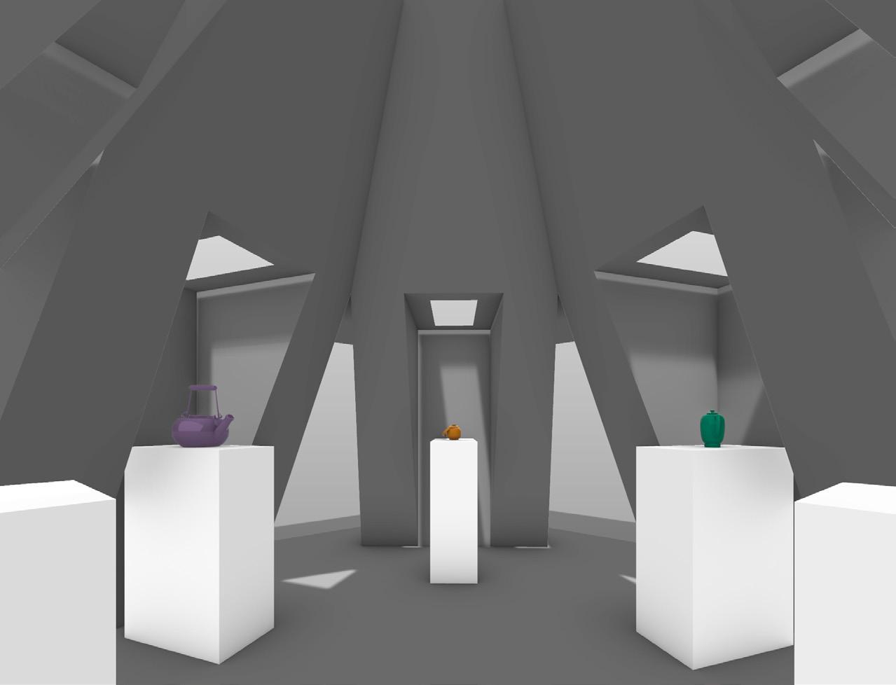 These section drawings highlight the importance of skylights in this pavilion. All the rooms have either a circle or rectangle skylight to allow light to shine on the 36 ceramics. The pavilion is split into fourteen rooms: four rooms of 5 objects, four rooms of 3 objects, and six rooms with one object where two rooms have a rectangular skylight and the other four have a circular skylight. The rooms vary in height and width but they all have the same depth so that the guests can compare the rooms differences to one similarity.