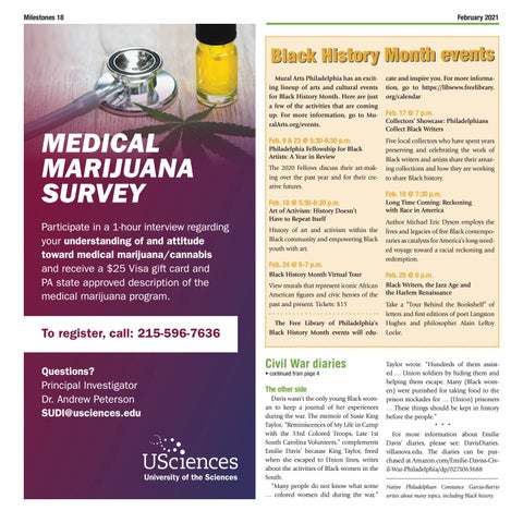 Taylor wrote. “Hundreds of them assisted … Union soldiers by hiding them and helping them escape. Many (Black women) were punished for taking food to the prison stockades for … (Union) prisoners … These things should be kept in history before the people.” * * * For more information about Emilie Davis’ diaries, please see: DavisDiaries. villanova.edu. The diaries can be purchased at Amazon.com/Emilie-Daviss-Civil-War-Philadelphia/dp/0271063688 Native Philadelphian Constance Garcia-Barrio writes about many topics, including Black history.