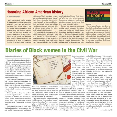 Honoring African American history By Alicia M. Colombo Black History Month was first proposed by black educators and the Black United Students at Ohio’s Kent State University in February 1969, and the first Black History Month celebration took place at the university a year later, from Jan. 2 to Feb. 28, 1970. Six years later, President Gerald Ford first officially recognized Black History Month, during the celebration of the United States Bicentennial by urging Americans to “seize the opportunity to honor the too-often neglected accom-