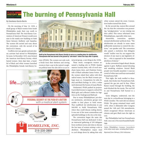 white women attend the event. Convention leaders turned him down. By the second day, rumors flew around the city that the convention was promoting “amalgamation,” as race mixing was then called. This rumor infuriated some Philadelphians, especially white men. Meanwhile, convention speakers stressed abolitionists’ political clout. “The abolitionists are already in some states sufficiently numerous to control the elections,” one speaker said. The convention also passed a resolution that delegates would “neither vote for, nor support the election of any man to any legislative office … who is opposed to the immediate abolition of slavery.” As the convention forged ahead, threats against it grew. Ruffians started shouting and smashing windows. Several Black people were brutally assaulted. A raucous crowd of white men and boys surrounded Pennsylvania Hall. That night, the mob swelled to thousands. Men broke into Pennsylvania Hall, opened the gas jets and lit fires. When flames roared through the building, the mob blocked the fire trucks. The roof fell in and Pennsylvania Hall burned to a shell. Some delegates, undeterred, met the next day in a schoolhouse belonging to a PFASS member. The mob did not destroy PFASS. The group remained intact until 1870, when it disbanded after Congress passed the 14th and 15th amendments, which recognized African Americans as citizens and gave Black men the right to vote. But Philadelphia had lost Pennsylvania Hall, once one of its most beautiful buildings. Native Philadelphian Constance Garcia-Barrio writes about many topics, including black history. Reprinted from February 2018 Milestones