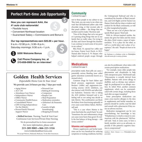 the Underground Railroad and who is considered the founder of Black journalism, and Civil Rights activist Fannie Lou Hamer, Kind calls her shop a window and catalyst for the Black community, as well as other marginalized peoples. “There are not a lot of places that are openly Black spaces,” Kind said. With its African-inspired textiles, the names she gives her lattes and the music she plays, Kind creates a space of representation. “It is a place for the other, as well as a joyful place and a place of acceptance,” she said. “People are here to be happy.” Jay Nachman is a freelance writer in Philadelphia who tells stories for a variety of clients.