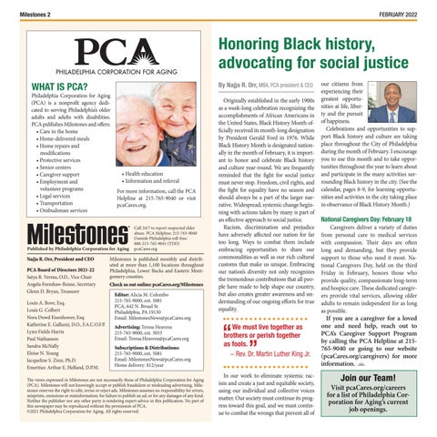 Milestones is published monthly and distributed at more than 1,100 locations throughout Philadelphia, Lower Bucks and Eastern Montgomery counties. Check us out online: pcaCares.org/Milestones Editor: Alicia M. Colombo 215-765-9000, ext. 5081 PCA, 642 N. Broad St. Philadelphia, PA 19130 Email: MilestonesNews@pcaCares.org Advertising: Teresa Heavens 215-765-9000, ext. 5053 Email: Teresa.Heavens@pcaCares.org Subscriptions & Distributions: 215-765-9000, ext. 5081 Email: MilestonesNews@pcaCares.org Home delivery: $12/year