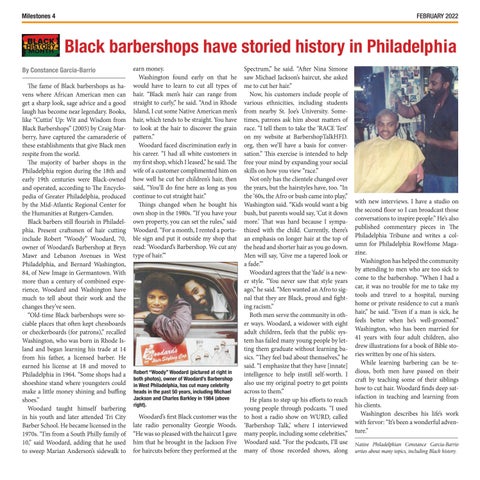 with new interviews. I have a studio on the second floor so I can broadcast those conversations to inspire people.” He’s also published commentary pieces in The Philadelphia Tribune and writes a column for Philadelphia RowHome Magazine. Washington has helped the community by attending to men who are too sick to come to the barbershop. “When I had a car, it was no trouble for me to take my tools and travel to a hospital, nursing home or private residence to cut a man’s hair,” he said. “Even if a man is sick, he feels better when he’s well-groomed.” Washington, who has been married for 41 years with four adult children, also drew illustrations for a book of Bible stories written by one of his sisters. While learning barbering can be tedious, both men have passed on their craft by teaching some of their siblings how to cut hair. Woodard finds deep satisfaction in teaching and learning from his clients. Washington describes his life’s work with fervor: “It’s been a wonderful adventure.” Native Philadelphian Constance Garcia-Barrio writes about many topics, including Black history.