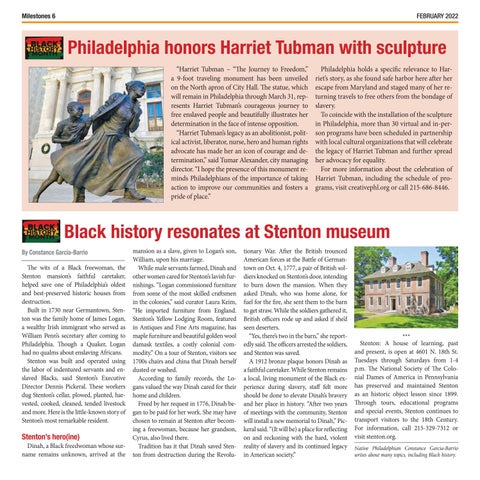 Black history resonates at Stenton museum By Constance Garcia-Barrio The wits of a Black freewoman, the Stenton mansion’s faithful caretaker, helped save one of Philadelphia’s oldest and best-preserved historic houses from destruction. Built in 1730 near Germantown, Stenton was the family home of James Logan, a wealthy Irish immigrant who served as William Penn’s secretary after coming to Philadelphia. Though a Quaker, Logan had no qualms about enslaving Africans. Stenton was built and operated using the labor of indentured servants and enslaved Blacks, said Stenton’s Executive Director Dennis Pickeral. These workers dug Stenton’s cellar, plowed, planted, harvested, cooked, cleaned, tended livestock and more. Here is the little-known story of Stenton’s most remarkable resident.