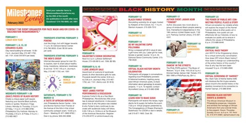 WEEKDAYS FEBRUARY 1-28 (QUILT) PIECES OF BLACK HISTORY Create a unique paper quilt square featuring your favorite Black authors, books or quotes. Nicetown-Tioga Library: Monday to Thursday, 2-5 p.m. & Friday, 1-4 p.m | 215-685-9790. Philadelphia City Institute: Monday to Thursday, 2-6 p.m. & Friday, 2-5 p.m. | 215-685-6621