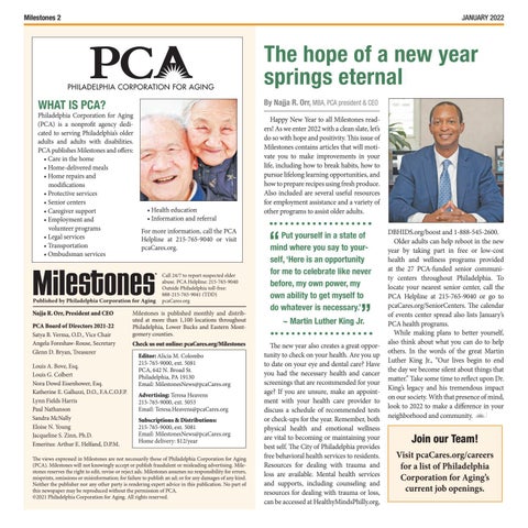 DBHIDS.org/boost and 1-888-545-2600. Older adults can help reboot in the new year by taking part in free or low-cost health and wellness programs provided at the 27 PCA-funded senior community centers throughout Philadelphia. To locate your nearest senior center, call the PCA Helpline at 215-765-9040 or go to pcaCares.org/SeniorCenters. The calendar of events center spread also lists January’s PCA health programs. While making plans to better yourself, also think about what you can do to help others. In the words of the great Martin Luther King Jr., “Our lives begin to end the day we become silent about things that matter.” Take some time to reflect upon Dr. King’s legacy and his tremendous impact on our society. With that presence of mind, look to 2022 to make a difference in your neighborhood and community. Funded by PCA