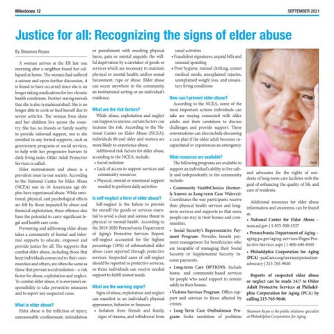 and advocates for the rights of residents of long-term care facilities with the goal of enhancing the quality of life and care of residents. Additional resources for elder abuse information and awareness can be found at: • National Center for Elder Abuse – ncea.acl.gov | 1-855-500-3537 • Pennsylvania Department of Aging – aging.pa.gov/aging-services/Pages/Protective-Services aspx | 1-800-490-8505 • Philadelphia Corporation for Aging (PCA)–pcaCares.org/services/protectionadvocacy | 215-765-9040 Reports of suspected elder abuse or neglect can be made 24/7 to Older Adult Protective Services at Philadelphia Corporation for Aging (PCA) by calling 215-765-9040. Shannon Reyes is the public relations specialist at Philadelphia Corporation for Aging.
