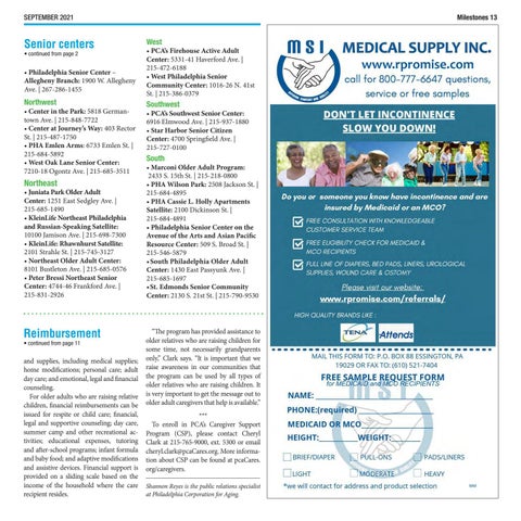 “The program has provided assistance to older relatives who are raising children for some time, not necessarily grandparents only,” Clark says. “It is important that we raise awareness in our communities that the program can be used by all types of older relatives who are raising children. It is very important to get the message out to older adult caregivers that help is available.” *** To enroll in PCA’s Caregiver Support Program (CSP), please contact Cheryl Clark at 215-765-9000, ext. 5300 or email cheryl.clark@pcaCares.org. More information about CSP can be found at pcaCares. org/caregivers. Shannon Reyes is the public relations specialist at Philadelphia Corporation for Aging.